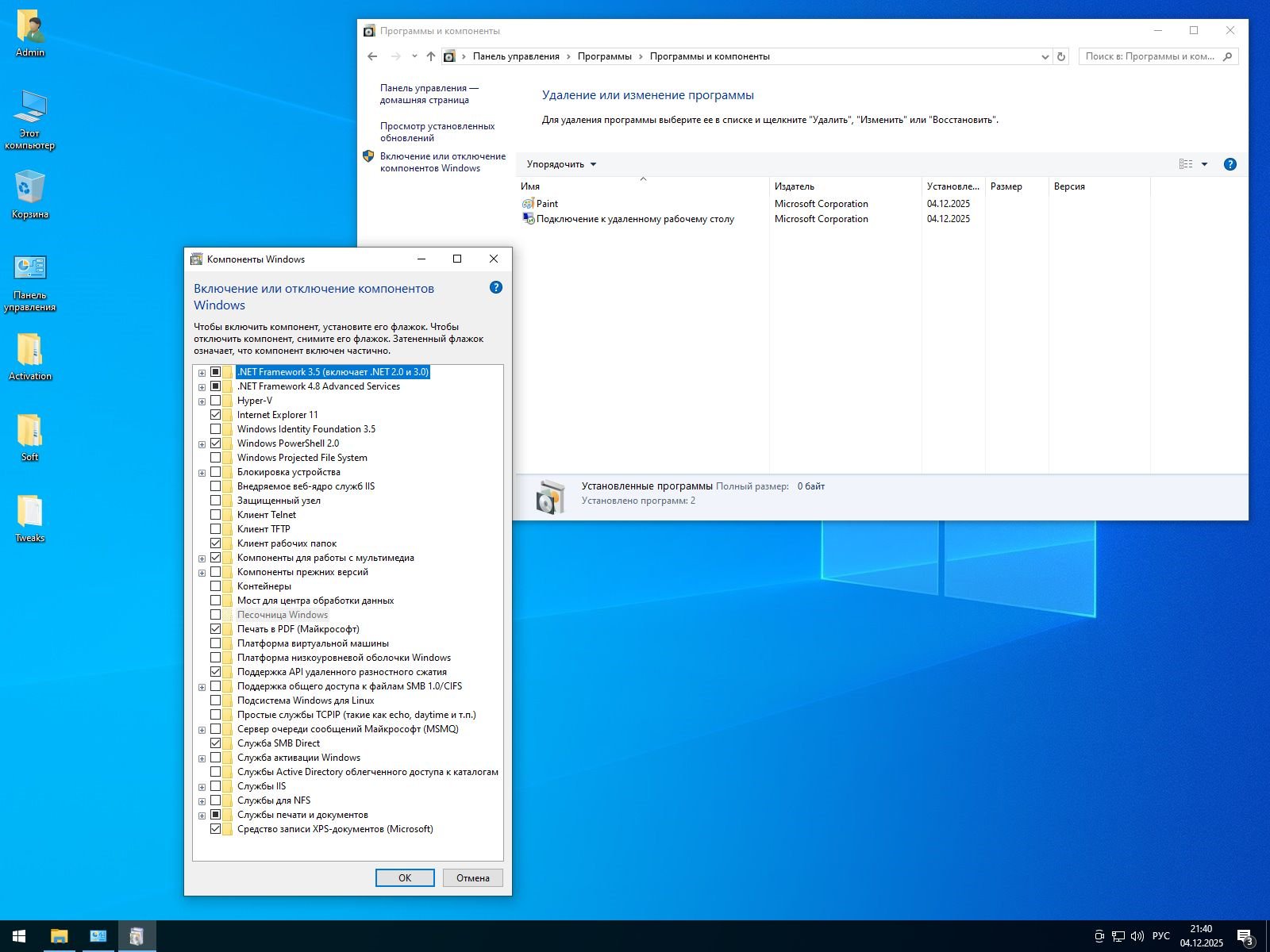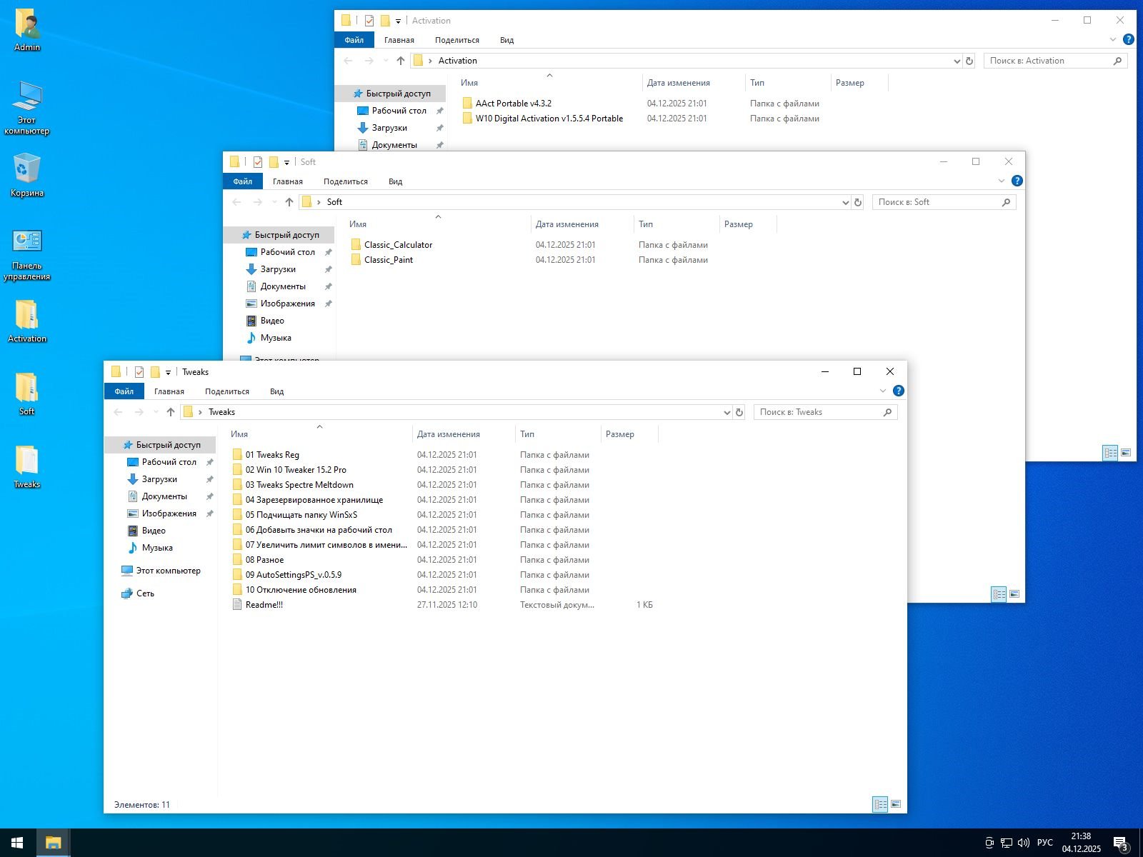 На рабочий стол добавлена папка с программами для активации Windows 10 Pro 64 bit 22H2 без Защитника. Вы сможете воспользоваться AAct или W10 Digital Activation Program на выбор.