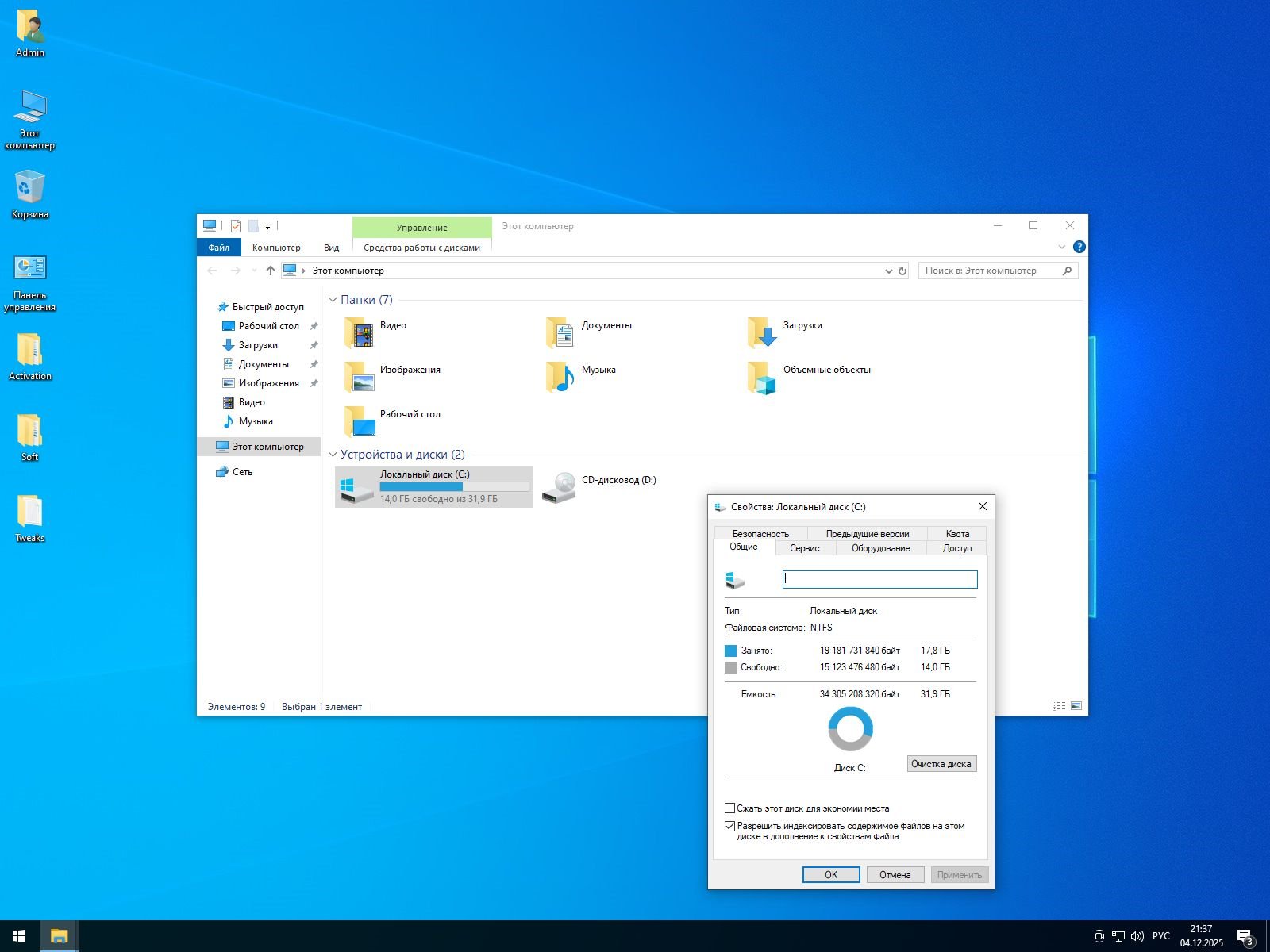 • После распаковки файлов Windows 10 Pro x64 Lite Edition займет на локальном накопителе 18 Гб. Но лучше отводить под системный раздел 40-50 Гб, чтобы впоследствии не испытывать недостатка места под программы и драйверы.