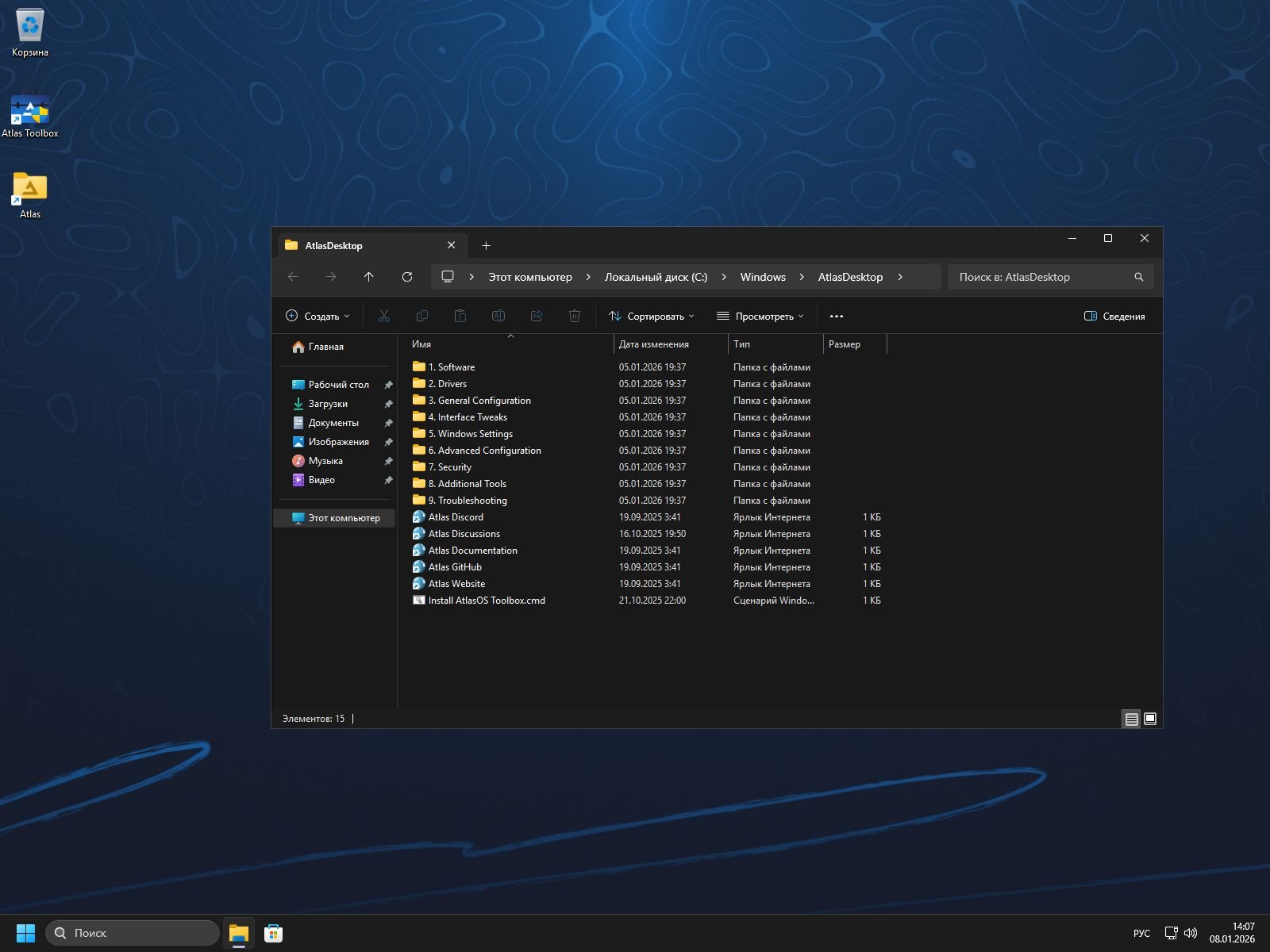 AtlasOS – это международная команда разработчиков, создающих оптимизированные Windows 11 Pro x64 25H2 на русском. В ОС нет никакой лишней анимации и прочих эффектов, которые тормозят загрузку системы и снижают производительность. Компьютер в любом случае будет работать максимально быстро и без критических ошибок (если не накосячит пользователь). Над данной версией Виндовс 11 Профессиональной 64 бит на русском поработали опытные программисты, поэтому никаких особенных багов ожидать не приходится. Также были проведены тесты на нескольких компьютерах, которые показали полную стабильность ОС. Максимально быстрая реакция на любое действие обеспечивается за счет отсутствия лишних приложений и фоновых процессов. Благодаря этому система одинаково хорошо подходит как для слабых компьютеров, так и для мощного современного железа. Скачать Windows 11 Pro 25H2 x64 облегченный вариант 2026 торрент можно рекомендовать геймерам, так как ОС позволяет видеокарте обрабатывать графику в ускоренном режиме. При необходимости вы всегда сможете вернуть в систему некоторые удаленные и отключенные компоненты, которые авторы заблокировали с целью повышения производительности. Для этого на рабочий стол добавлена папка с твиками. Так, к примеру, вы сможете восстановить браузер Edge. В этой же папке вы сможете найти есть набор программ для ускорения работы системы, диагностики ее состояния, а также проверки физических параметров компа, таких как температура. Но в принципе мы не советуем изменять предустановленные настройки, так как они обеспечивают оптимальное быстродействие.